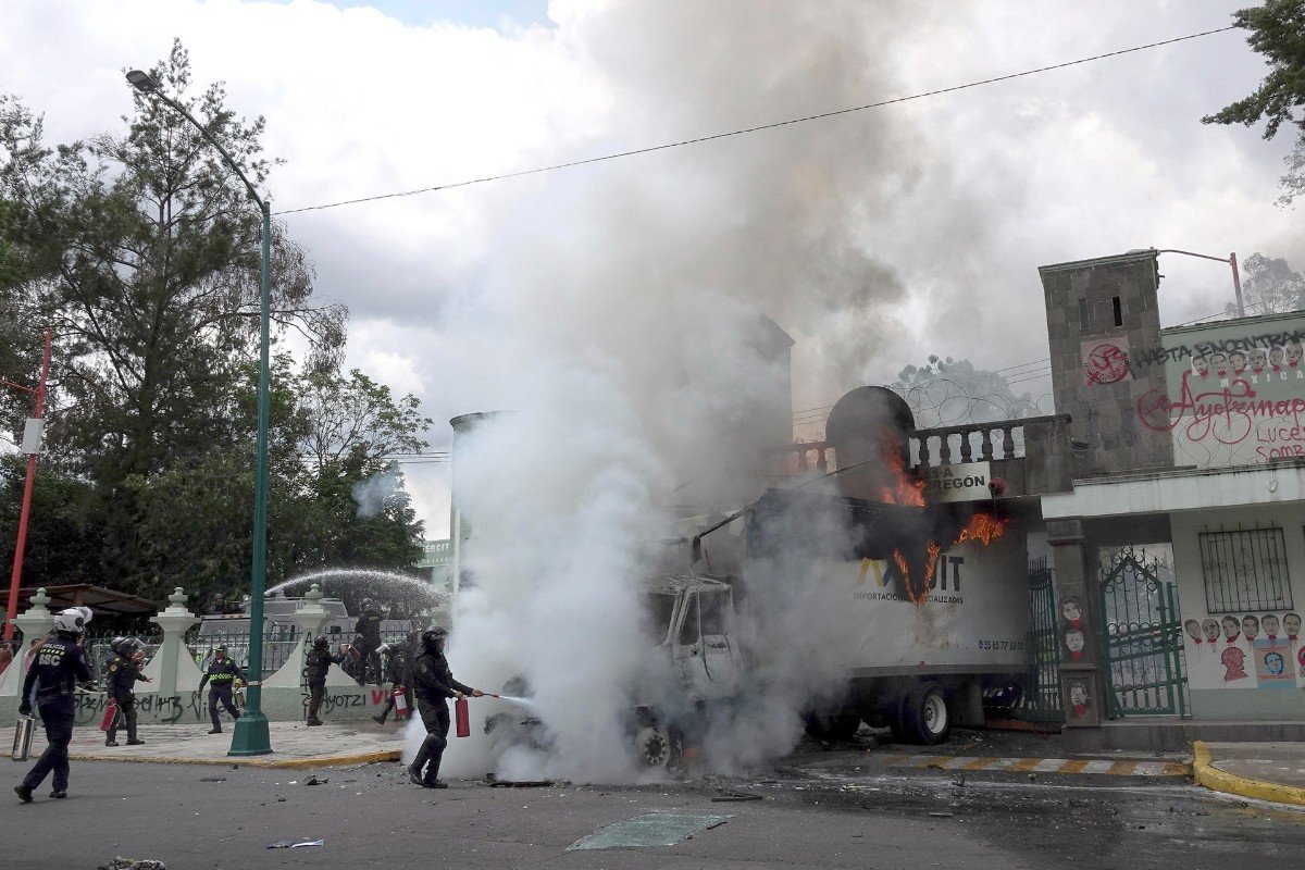 Estos agresores, que se unieron a la protesta encabezada por padres y compañeros de los normalistas, lanzaron explosivos, realizaron pintas en los muros y utilizaron un camión de carga para derribar la puerta principal del recinto militar. Posteriormente, incendiaron la pesada unidad, la cual quedó completamente consumida por el fuego.